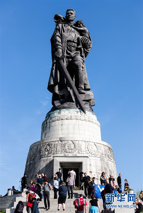 5月8日,在德国首都柏林,人们站在特雷普托苏军烈士陵园内的一尊雕像前。 当日,许多德国柏林民众自发前往相关场所纪念第二次世界大战“欧洲胜利日”75周年。 新华社发(张平摄)