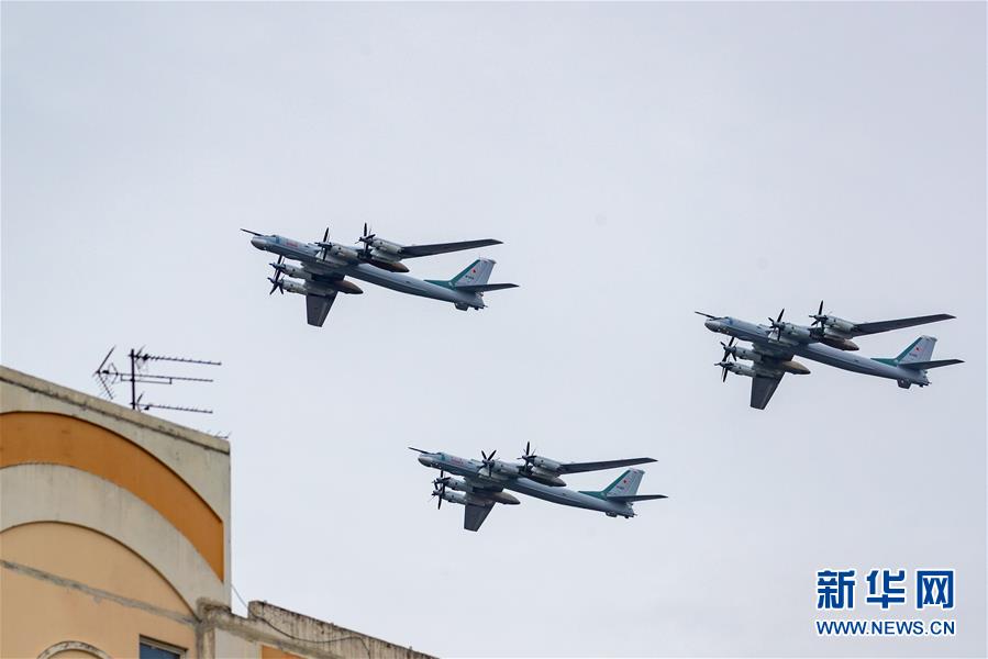 5月9日,在俄罗斯首都莫斯科,图-95MS战略轰炸机编队参加卫国战争胜利日空中阅兵。 新华社记者 白雪骐 摄