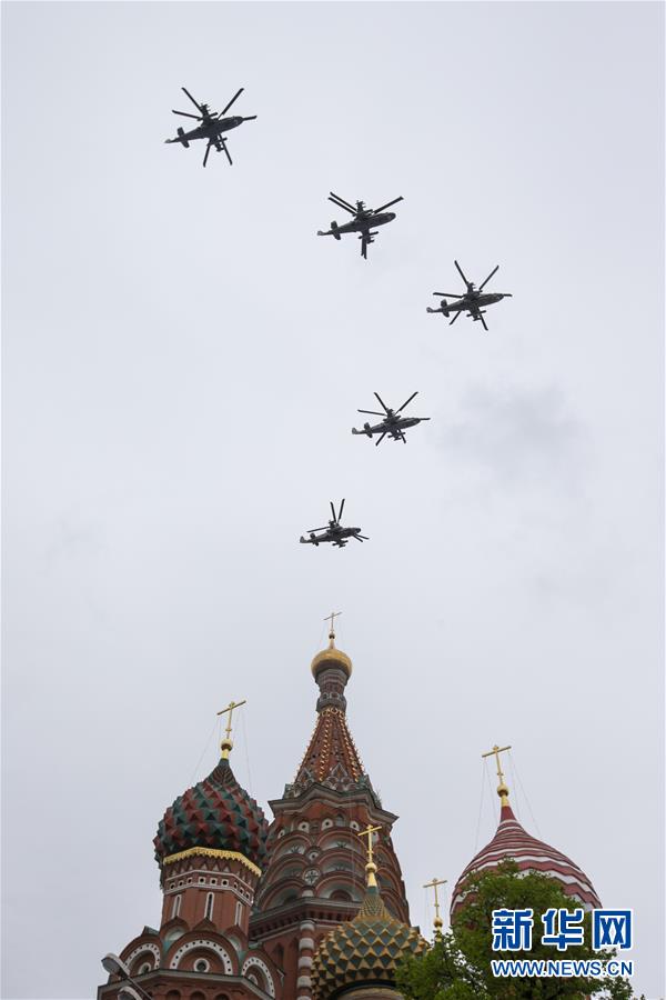 5月9日,在俄罗斯首都莫斯科,卡-52武装直升机编队参加卫国战争胜利日空中阅兵。新华社发(亚历山大摄)