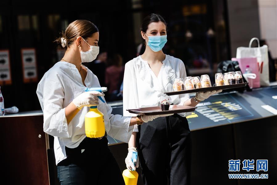 这是5月9日在德国首都柏林的一家购物中心拍摄的向顾客提供甜点的两名工作人员。 德国联邦政府与各州政府6日达成新协议,其中包括所有商店在满足卫生、限流等条件下可重新开放。购物重新成为柏林民众度过周末的方式之一。 新华社发(张平摄)