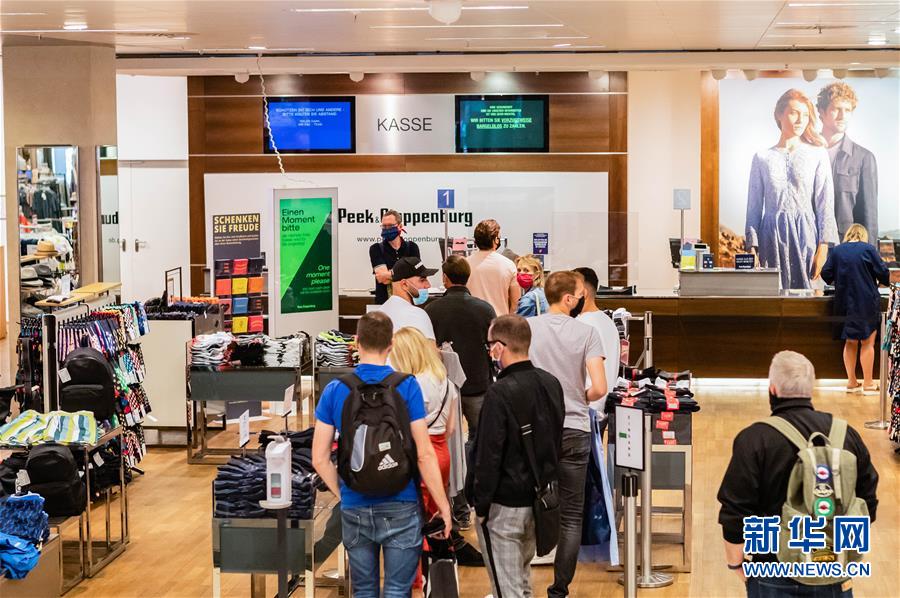 5月9日,在德国首都柏林,顾客在一家商店内的收银台前排队等候结账。 德国联邦政府与各州政府6日达成新协议,其中包括所有商店在满足卫生、限流等条件下可重新开放。购物重新成为柏林民众度过周末的方式之一。 新华社发(张平摄)