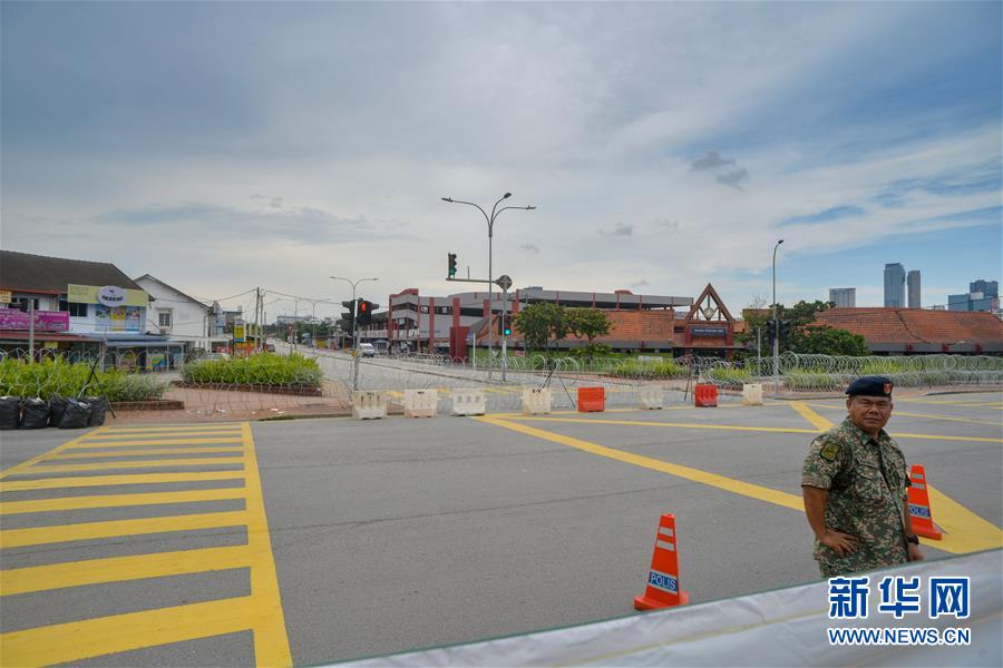 5月10日,一名士兵在马来西亚雪兰莪州一处因新冠疫情而封锁的小区外执勤。新华社发(张纹综摄)