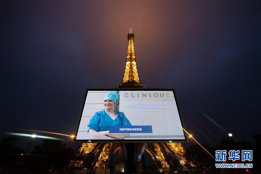 5月10日,法国巴黎埃菲尔铁塔前的大屏幕上播放一名护士代表的照片。 10日晚,法国巴黎埃菲尔铁塔前竖起大屏幕,滚动播放在疫情期间坚守岗位的医护人员、消防员、快递员、清洁工等劳动者的照片,并配上“巴黎感谢那些让我们怎么谢都谢不够的人们”等字幕,向他们致谢并致敬。法国将于5月11日起逐步放松应对疫情的限制性措施。 新华社发(杰克·陈摄)