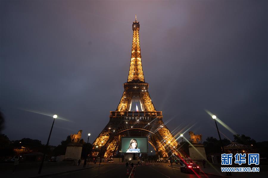 5月10日,法国巴黎埃菲尔铁塔前的大屏幕上播放一名医生代表的照片。 10日晚,法国巴黎埃菲尔铁塔前竖起大屏幕,滚动播放在疫情期间坚守岗位的医护人员、消防员、快递员、清洁工等劳动者的照片,并配上“巴黎感谢那些让我们怎么谢都谢不够的人们”等字幕,向他们致谢并致敬。法国将于5月11日起逐步放松应对疫情的限制性措施。 新华社发(杰克·陈摄)
