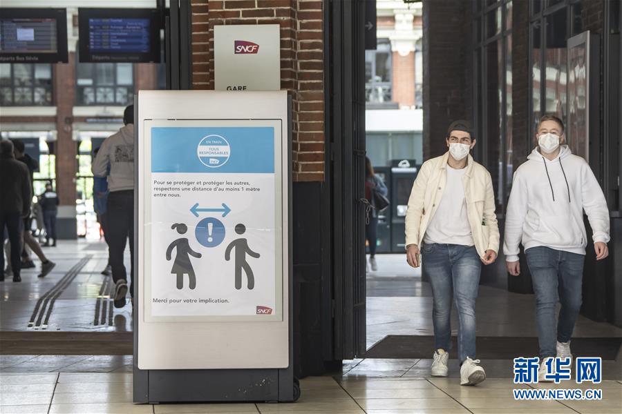 5月11日,在法国北部城市里尔,人们走过火车站内提醒“保持社交距离”的标牌。 根据法国政府的解禁计划,自5月11日起,法国开始逐步解封。 新华社发(塞巴斯蒂安·库尔吉 摄)