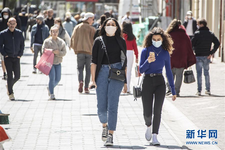 5月11日,在法国北部城市里尔,人们戴着口罩走在街上。 根据法国政府的解禁计划,自5月11日起,法国开始逐步解封。 新华社发(塞巴斯蒂安·库尔吉 摄)