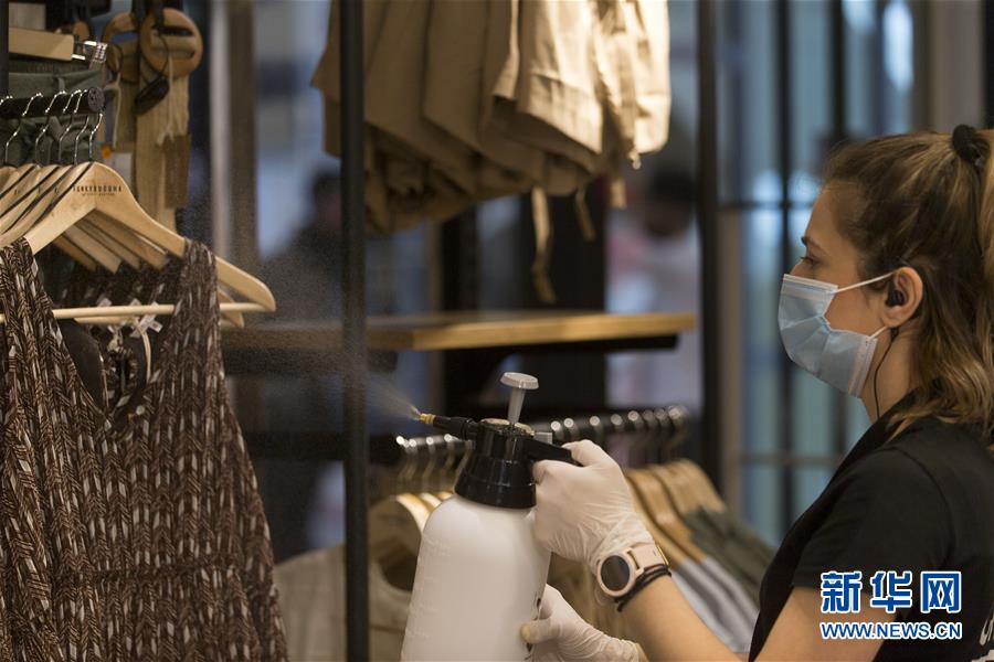 5月11日,在希腊雅典,一名店员在店内消毒。 按照希腊政府的“解封”计划,希腊正逐步恢复商业,重启经济。 新华社发(马里奥斯·罗洛斯 摄)