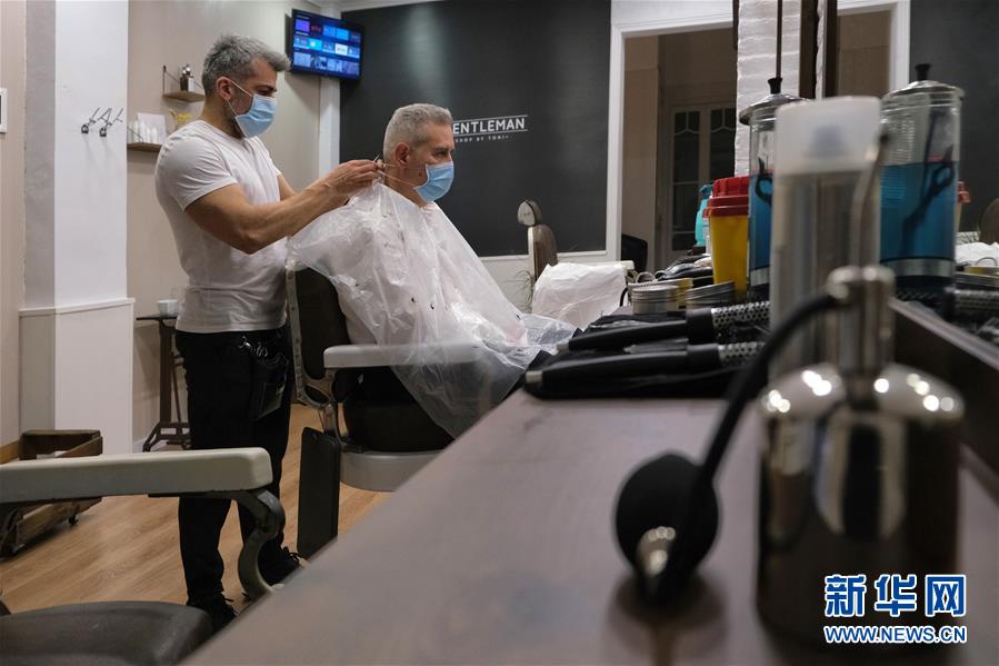 5月11日,一名理发师在西班牙巴塞罗那市中心的一家理发店内为顾客服务。 据西班牙卫生部11日发布的新冠疫情数据,该国单日死亡病例数继续下降。从11日开始,西班牙全国约一半人口所在地区进入管制措施降级第一阶段。 新华社发(塞尔希·卡马拉摄)