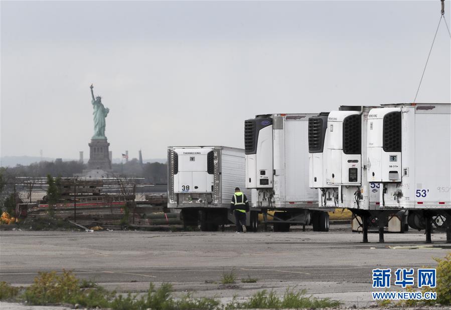 5月11日,冷藏车停放在美国纽约布鲁克林一处新开辟的临时停尸场所内。 美国约翰斯·霍普金斯大学11日发布的新冠疫情最新统计数据显示,美国累计死亡病例超过8万例。 新华社记者 王迎 摄