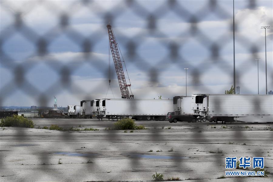 5月11日,冷藏车停放在美国纽约布鲁克林一处新开辟的临时停尸场所内。 美国约翰斯·霍普金斯大学11日发布的新冠疫情最新统计数据显示,美国累计死亡病例超过8万例。 新华社记者 王迎 摄