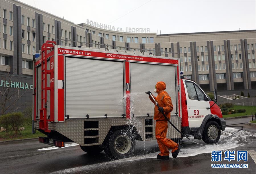 5月12日,在俄罗斯圣彼得堡,工作人员为消防车消毒。 俄罗斯圣彼得堡一家收治新冠病毒感染者的医院12日发生火灾,造成5人死亡,医院内150名医生和病人被疏散。 新华社/卫星社