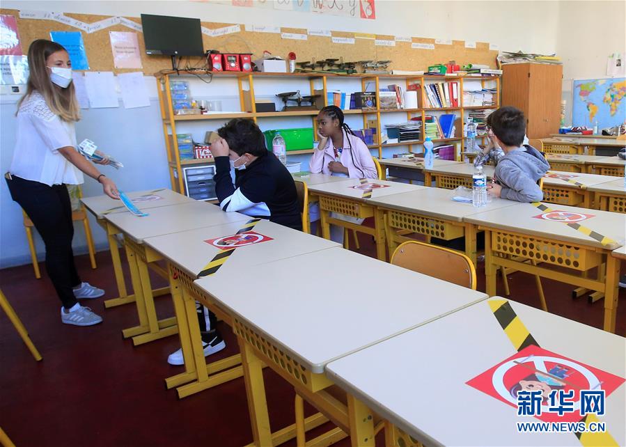 5月12日,在法国南部城市尼斯的西蒙娜·维伊小学,一张课桌上贴着“禁止使用”的标识。 法国从11日开始执行解禁措施。法国总理菲利普表示,逐步解禁的过程将至少持续数周。在第一阶段,商店和学校将重新开放,80%至85%的学校将复课,约100万名学生和13万名教师将返校。 新华社发(塞尔热·阿乌兹 摄)