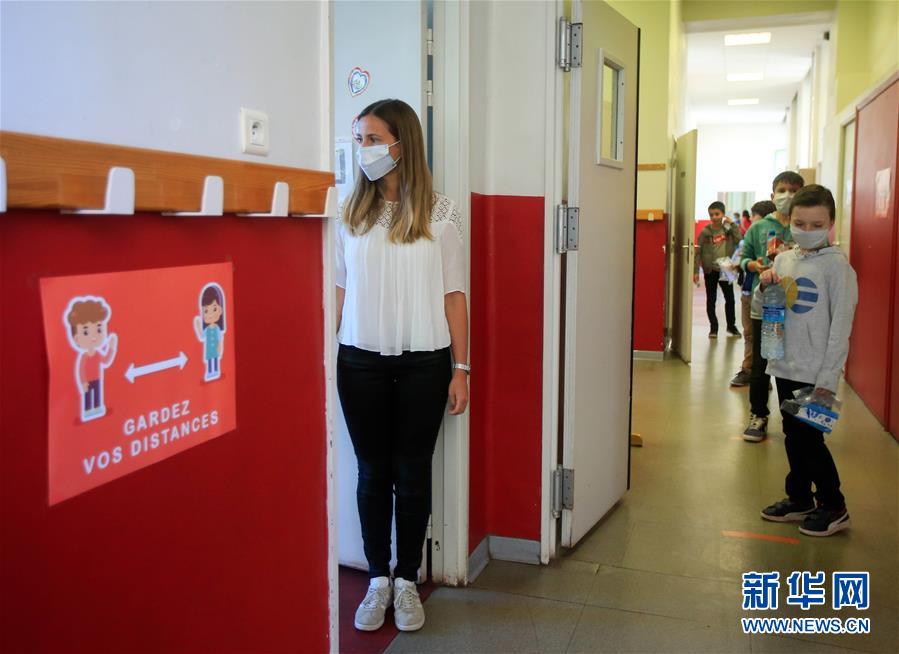 5月12日,在法国南部城市尼斯的西蒙娜·维伊小学,学生排队等待进入教室。 法国从11日开始执行解禁措施。法国总理菲利普表示,逐步解禁的过程将至少持续数周。在第一阶段,商店和学校将重新开放,80%至85%的学校将复课,约100万名学生和13万名教师将返校。 新华社发(塞尔热·阿乌兹 摄)