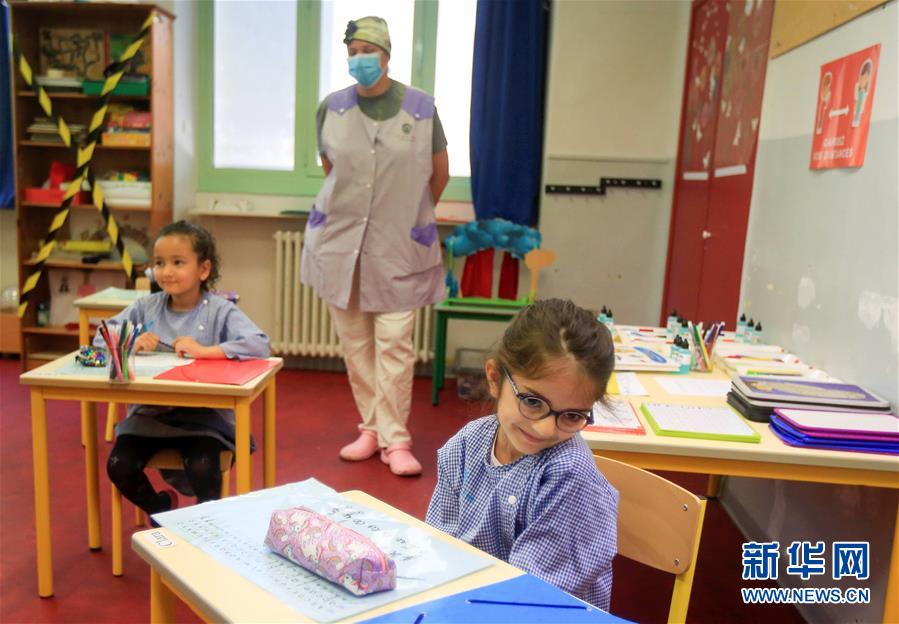 5月12日,在法国南部城市尼斯的西蒙娜·维伊小学,学生在教室内上课。 法国从11日开始执行解禁措施。法国总理菲利普表示,逐步解禁的过程将至少持续数周。在第一阶段,商店和学校将重新开放,80%至85%的学校将复课,约100万名学生和13万名教师将返校。 新华社发(塞尔热·阿乌兹 摄)