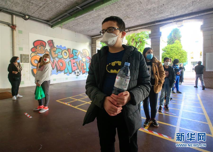 5月12日,在法国南部城市尼斯,学生在西蒙娜·维伊小学外排队等待进入。 法国从11日开始执行解禁措施。法国总理菲利普表示,逐步解禁的过程将至少持续数周。在第一阶段,商店和学校将重新开放,80%至85%的学校将复课,约100万名学生和13万名教师将返校。 新华社发(塞尔热·阿乌兹 摄)