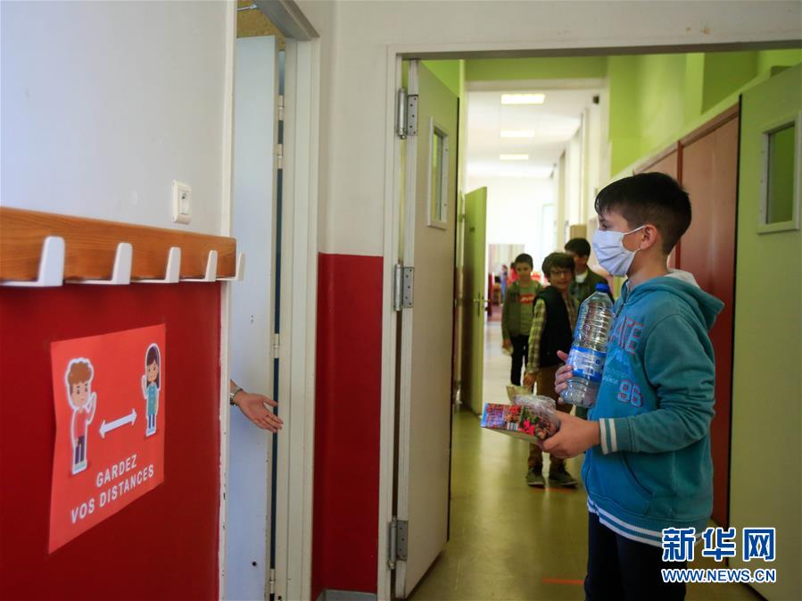 5月12日,在法国南部城市尼斯的西蒙娜·维伊小学,学生排队等待进入教室。 法国从11日开始执行解禁措施。法国总理菲利普表示,逐步解禁的过程将至少持续数周。在第一阶段,商店和学校将重新开放,80%至85%的学校将复课,约100万名学生和13万名教师将返校。 新华社发(塞尔热·阿乌兹 摄)