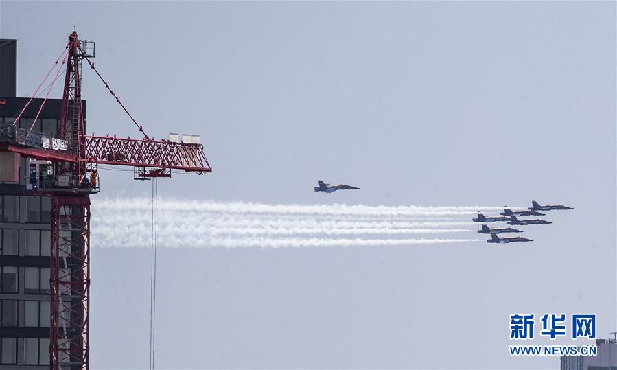 5月12日,美国海军“蓝天使”特技飞行表演队飞过芝加哥上空。 美国海军“蓝天使”特技飞行表演队12日在美国芝加哥进行飞行表演,向当地参与抗击新冠疫情的医护工作者等致敬。 新华社发(乔尔·莱纳摄)