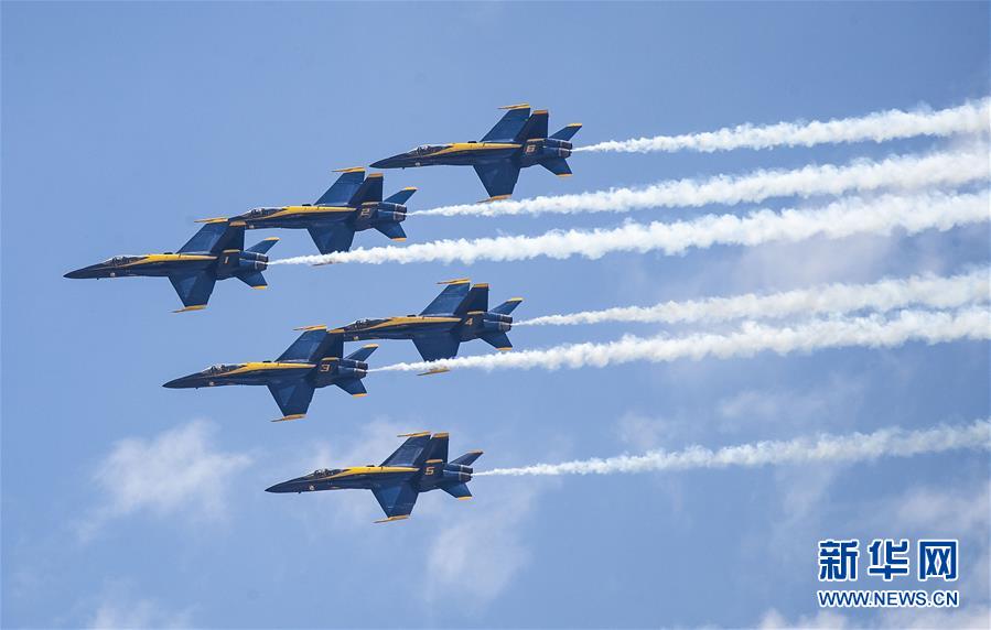 5月12日,美国海军“蓝天使”特技飞行表演队飞过芝加哥上空。 美国海军“蓝天使”特技飞行表演队12日在美国芝加哥进行飞行表演,向当地参与抗击新冠疫情的医护工作者等致敬。 新华社发(乔尔·莱纳摄)