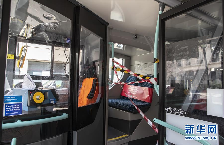 5月12日,在英国伦敦,一辆公交车的驾驶室所在的车厢前半部被缠上胶带。 英国卫生部5月12日发布的新冠疫情数据显示,该国的死亡病例数达到32692例,与前一天相比增加627例。 新华社记者 韩岩 摄