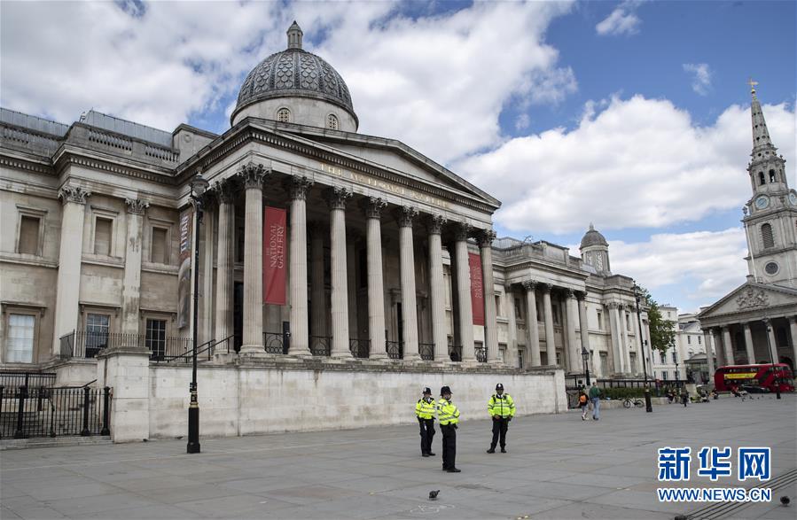 5月12日,在英国伦敦,几名警察在关闭的国家美术馆前执勤。 英国卫生部5月12日发布的新冠疫情数据显示,该国的死亡病例数达到32692例,与前一天相比增加627例。 新华社记者 韩岩 摄