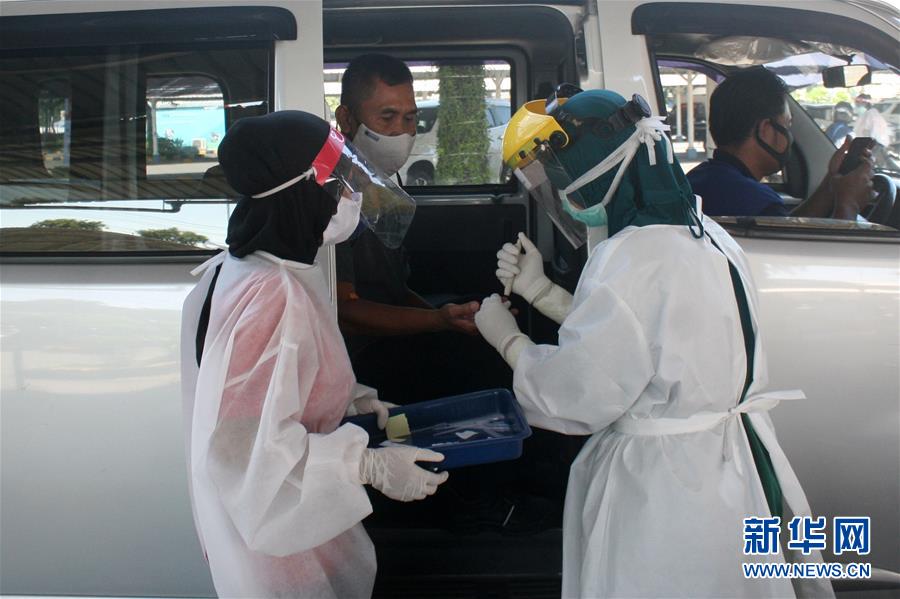 5月13日,在印度尼西亚诗都阿佐一处新冠病毒快速检测点,医务工作者为车上人员进行新冠病毒检测。 印度尼西亚卫生部13日发布的新冠疫情数据显示,该国确诊病例比前一天增加689例,是印尼疫情暴发以来单日新增最高水平。该国目前累计确诊15438例,累计死亡1028例,累计治愈3287例。 新华社发(库尔尼亚万摄)