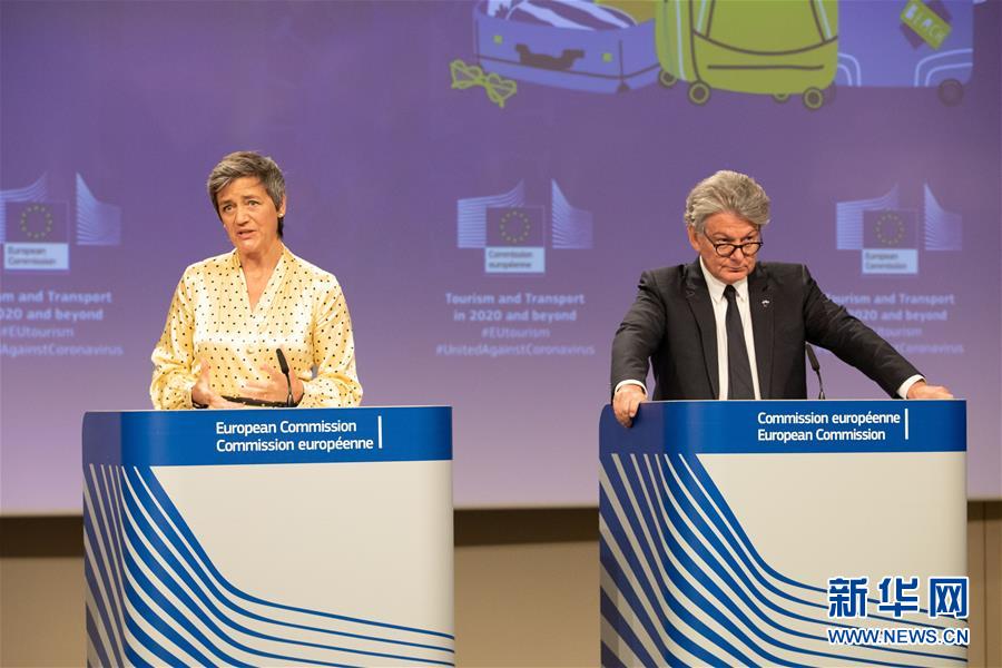 5月13日,在比利时布鲁塞尔欧盟总部,欧盟委员会执行副主席玛格丽特·韦斯塔格(左)和欧盟委员会负责内部市场的委员蒂埃里·布雷东出席新闻发布会。 新华社发(欧盟供图)