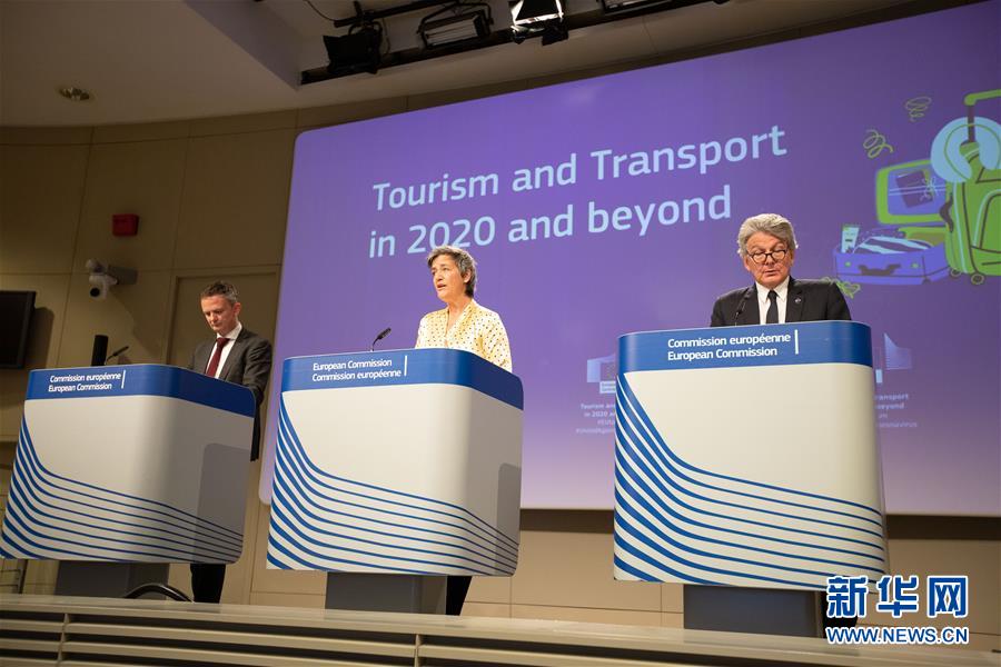 5月13日,在比利时布鲁塞尔欧盟总部,欧盟委员会执行副主席玛格丽特·韦斯塔格(中)和欧盟委员会负责内部市场的委员蒂埃里·布雷东(右)出席新闻发布会。新华社发(欧盟供图)