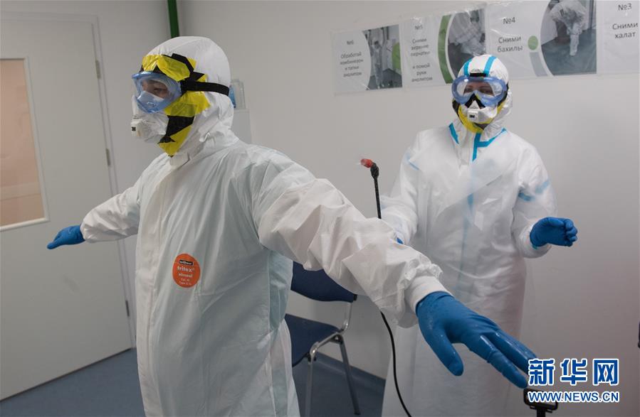 5月14日,在俄罗斯首都莫斯科一家医院,医护人员接受消毒。 据俄罗斯防疫指挥部14日消息,俄过去24小时新增新冠确诊病例9974例,累计确诊252245例。这是自5月2日以来,俄单日新增病例数首次低于1万例。 新华社/卫星社