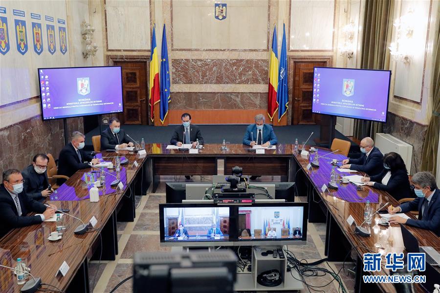 5月14日,在罗马尼亚首都布加勒斯特,罗马尼亚总理奥尔班(中左)主持召开全国紧急情况委员会会议。 新华社发(克里斯泰尔摄)