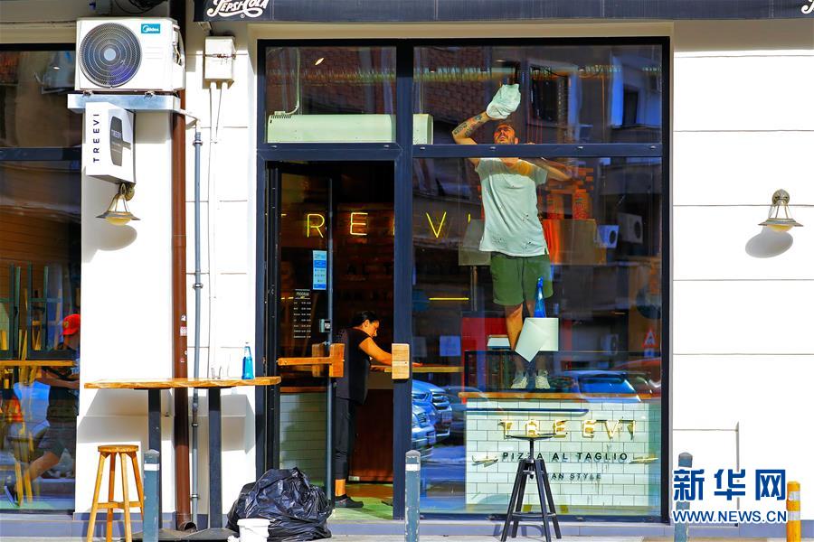 5月14日,在罗马尼亚首都布加勒斯特,一名男子擦拭一家商铺的橱窗玻璃。 新华社发(克里斯泰尔摄)