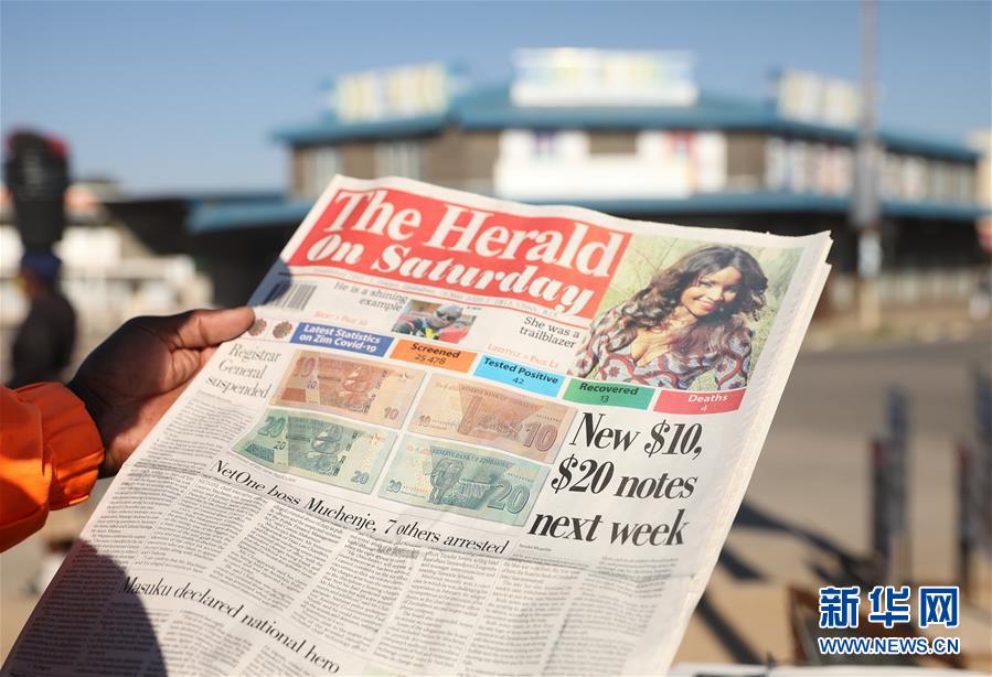5月16日,在津巴布韦首都哈拉雷,市民浏览刊登10元和20元面值的新津巴布韦元票样的报纸。 津巴布韦储备银行(央行)15日发表声明说,将发行10元和20元面值的新津巴布韦元,以增加市场流动性,缓解现金短缺局面。 新华社发(肖恩·朱萨摄)