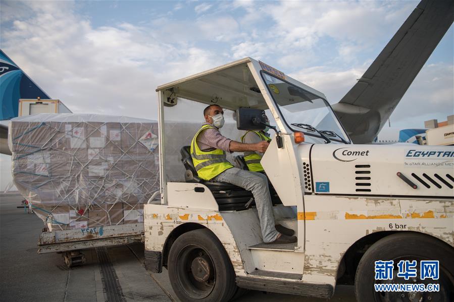 5月16日,在埃及开罗国际机场,工作人员运输中国向埃及援助的抗疫物资。 中国政府援助埃及的第三批抗疫物资16日在开罗国际机场完成交接。这批抗疫物资包括N95口罩、医用外科口罩、医用防护服、检测试剂、一次性外科手套及体温检测计。 新华社记者 邬惠我 摄