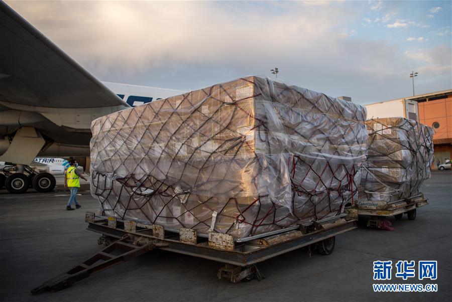 这是5月16日在埃及开罗国际机场拍摄的中国向埃及援助的抗疫物资。 中国政府援助埃及的第三批抗疫物资16日在开罗国际机场完成交接。这批抗疫物资包括N95口罩、医用外科口罩、医用防护服、检测试剂、一次性外科手套及体温检测计。 新华社记者 邬惠我 摄