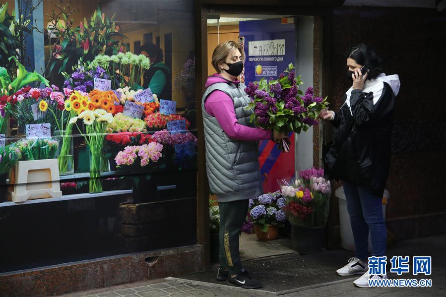5月14日,市民在乌克兰基辅市一家恢复营业的花店购买鲜花。 乌克兰政府5月4日决定将防疫隔离措施再次延期至5月22日,但自11日后逐步开放公园、广场、美容美发店、图书馆、博物馆以及除购物中心外的批发和零售场所。基辅市推迟一天至12日开始实施上述措施。 新华社发(谢尔盖·斯塔拉斯坚科摄)