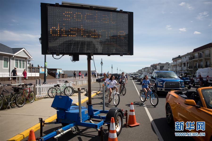 5月16日,在美国新泽西州贝尔马海滩附近,人们骑车经过一处提示保持社交距离的电子屏。 新华社发(郭克摄)