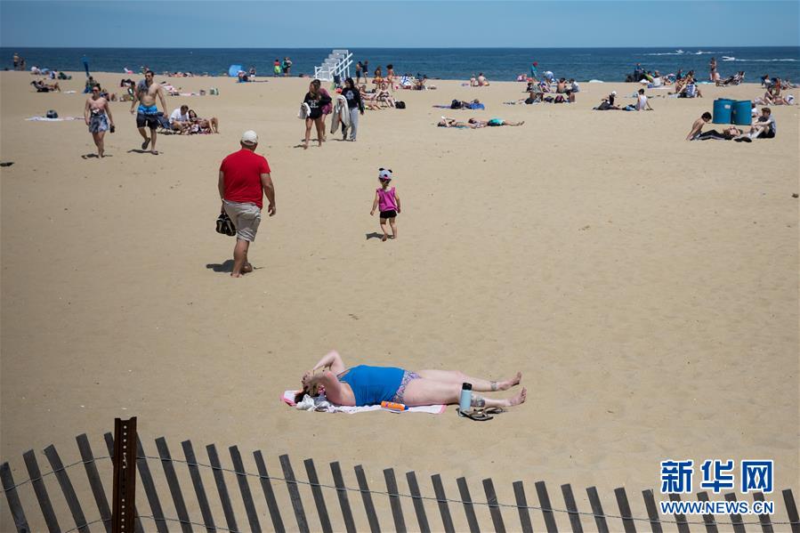 5月16日,人们在美国新泽西州贝尔马海滩享受阳光。 新华社发(郭克摄)