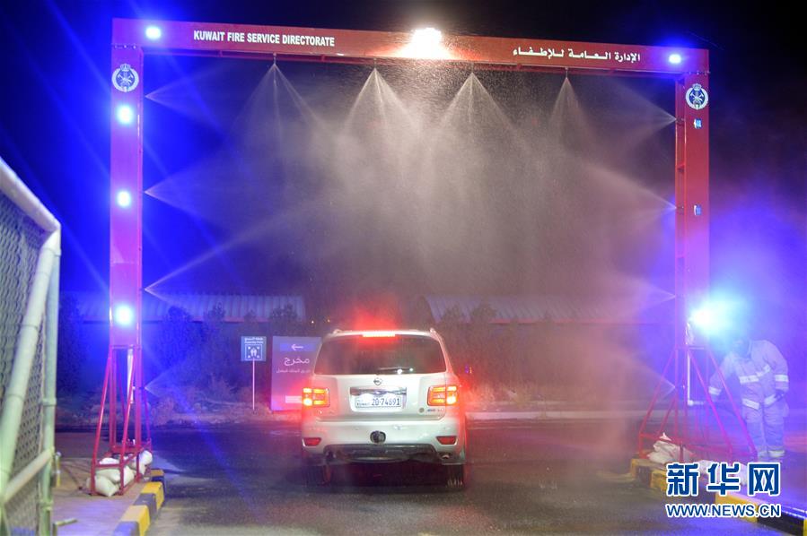5月16日,在科威特费尔瓦尼耶省,工作人员为驶出“免下车”新冠病毒检测中心的车辆消毒。新华社发(阿萨德摄)