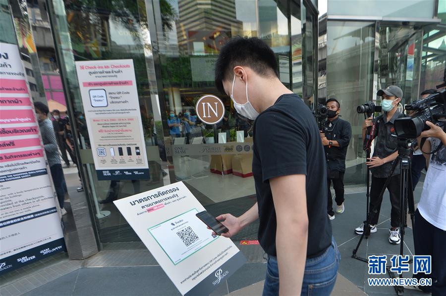 5月17日,在泰国曼谷一家商场外,顾客用手机扫描二维码登记入场。 泰国政府15日宣布,于17日重新开放商场和室内餐厅,同时宵禁时间自17日起缩短一个小时,改为每日23时至次日早上4时。 新华社发 (拉亨 摄)