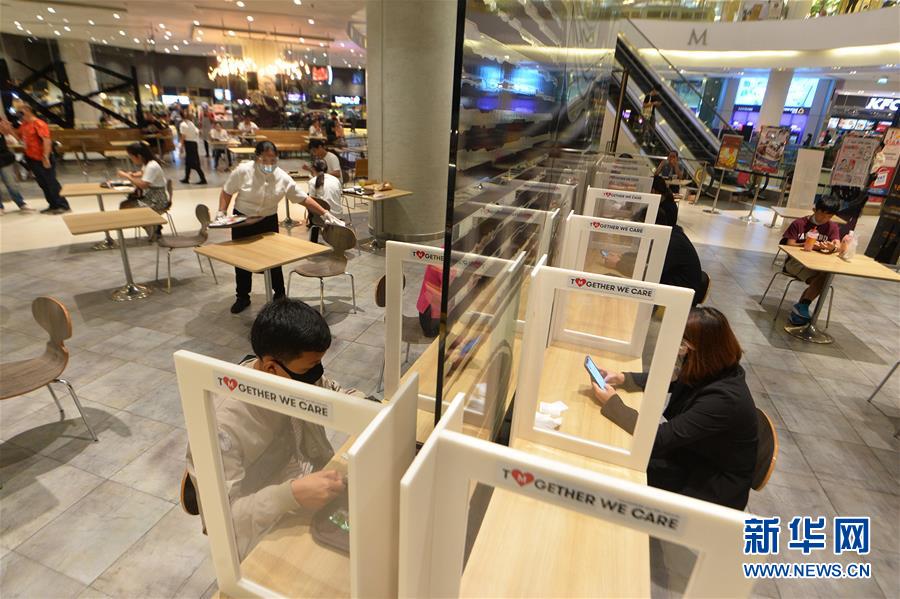 5月17日,顾客在泰国曼谷一家商场的餐厅用餐。 泰国政府15日宣布,于17日重新开放商场和室内餐厅,同时宵禁时间自17日起缩短一个小时,改为每日23时至次日早上4时。 新华社发 (拉亨 摄)