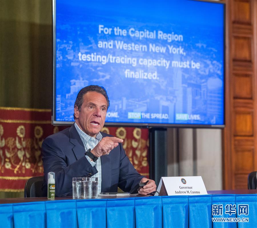 5月17日,美国纽约州州长安德鲁·科莫在奥尔巴尼举行的新闻发布会上讲话。 当日,科莫宣布纽约州新冠检测能力达到每天4万人次,并鼓励符合条件的居民接受检测。 新华社发(纽约州州长办公室供图 达伦·麦吉摄)