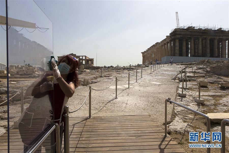 5月18日,希腊雅典卫城的工作人员清洁玻璃隔断。 新华社发(马里奥斯·罗洛斯摄)