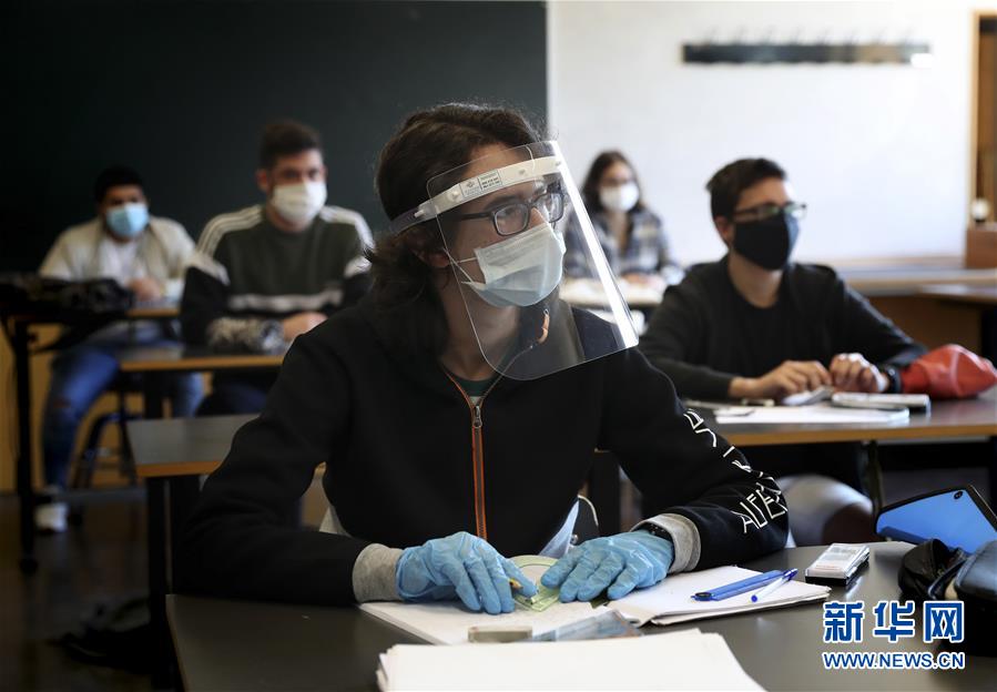 5月18日,葡萄牙辛特拉一所高中的学生戴着口罩、面罩和手套上课。新华社发(佩德罗·菲乌萨摄)