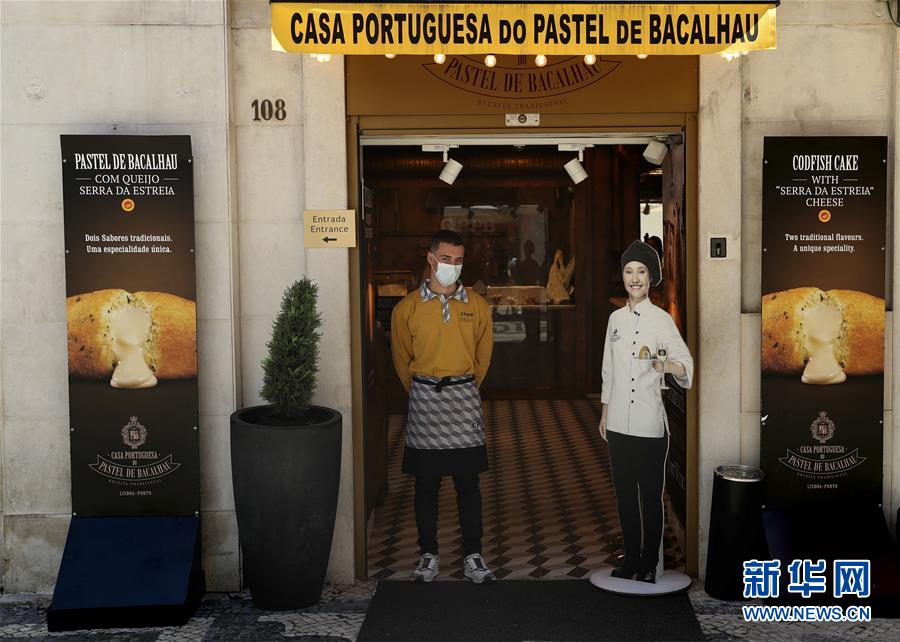 5月18日,在葡萄牙里斯本,一名戴口罩的服务员站在餐馆门口迎客。新华社发(佩德罗·菲乌萨摄)