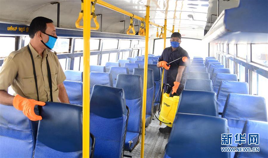 5月19日,在印度班加罗尔,工作人员在客运巴士上喷洒消毒剂。新华社发