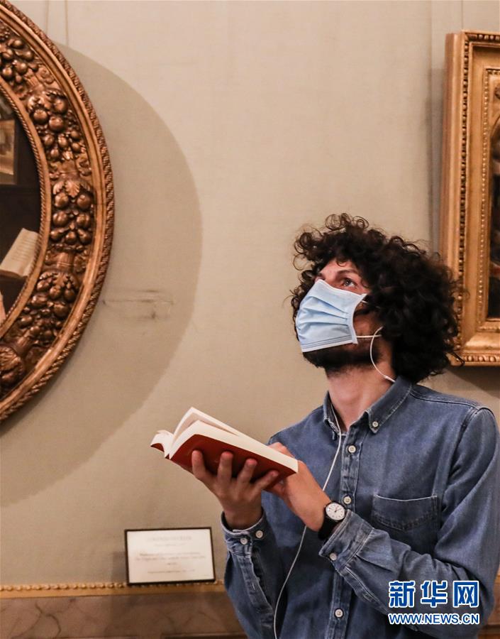 5月20日,在意大利首都罗马,一名参观者戴着口罩参观重新开放的博尔盖塞美术博物馆。 意大利民事保护部20日发布的数据显示,该国新冠疫情继续缓解,当天现有患者比前一天减少2377人,降至62752人;新增治愈病例2881例,累计治愈132282例。 新华社记者 程婷婷 摄