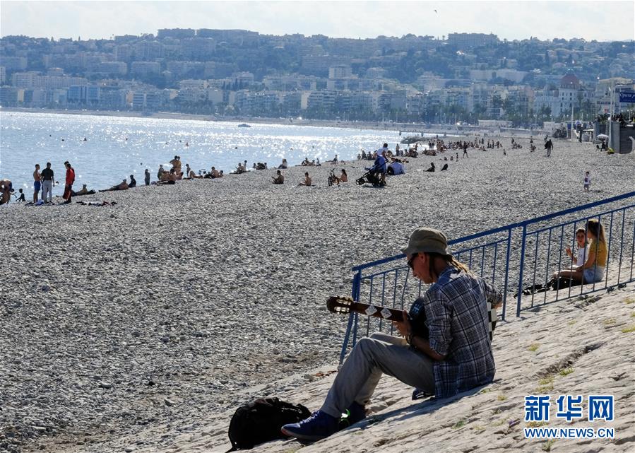 5月20日,在法国南部城市尼斯,人们在海边休闲。 法国政府20日公布的数据显示,法国新增新冠确诊病例418例,累计确诊143845例;新增新冠死亡病例110例,累计死亡病例28132例。法国自5月11日起逐步解封,海滩自16日起逐步对公众开放。 新华社发(塞尔热·阿乌兹摄)