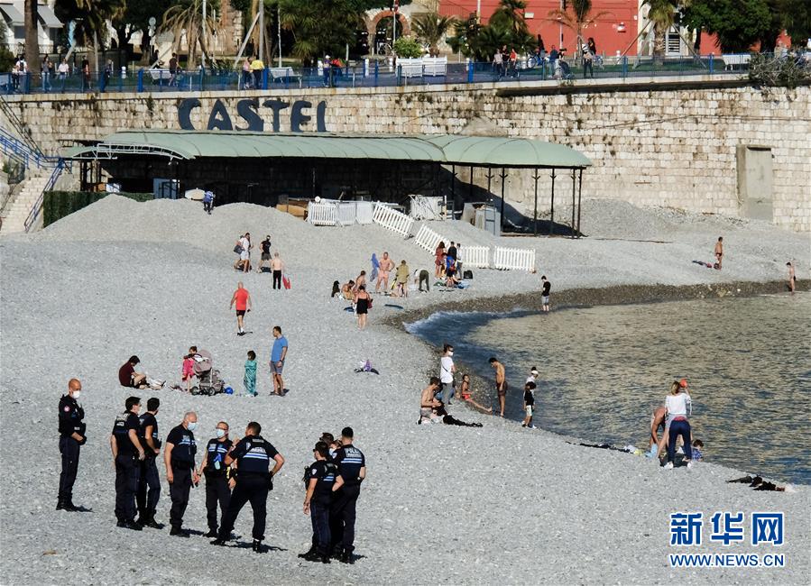 5月20日,在法国南部城市尼斯,警察在海滩上值勤。 法国政府20日公布的数据显示,法国新增新冠确诊病例418例,累计确诊143845例;新增新冠死亡病例110例,累计死亡病例28132例。法国自5月11日起逐步解封,海滩自16日起逐步对公众开放。 新华社发(塞尔热·阿乌兹摄)