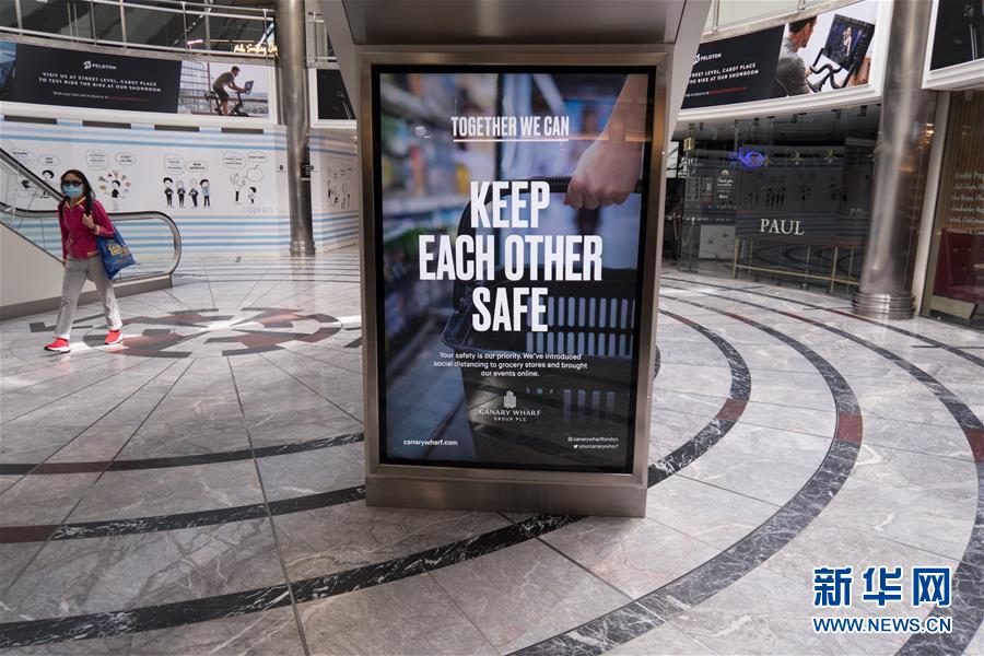 5月20日,英国伦敦金丝雀码头一家购物中心的广告牌上印有“一起保持健康”、“我们把您的安全放在首位”、“在商场内保持社交距离,将活动改为线上进行”等字样。 英国国家统计局5月19日公布的数据显示,英国4月份申请失业救济的人数环比跳涨69.1%至1996年以来最高水平。 新华社发(蒂姆·爱尔兰摄)