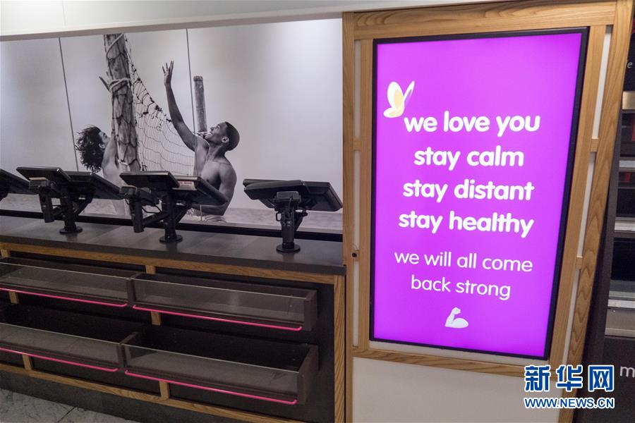 5月20日,在英国伦敦金丝雀码头一家购物中心内,一家关闭的餐馆外广告牌上印有“我们爱您”、“保持冷静”、“保持距离”、“保持健康”、“回归时我们都会更强大”的字样。 英国国家统计局5月19日公布的数据显示,英国4月份申请失业救济的人数环比跳涨69.1%至1996年以来最高水平。 新华社发(蒂姆·爱尔兰摄)