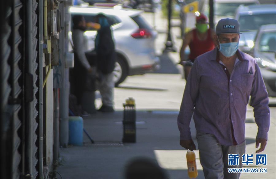 5月20日,在墨西哥蒂华纳,一名男子戴口罩出行。 墨西哥卫生部20日晚宣布,墨西哥新增新冠确诊病例2248例,累计确诊56594例;新增死亡病例424例,累计死亡6090例。 新华社发(乔贝丝·特里克斯摄)